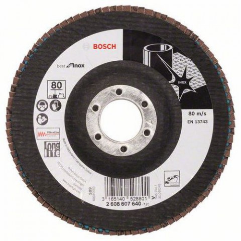 Zvláště se hodí na ušlechtilou ocel (Inox). Vysoce výkonné díky vysoce účinnému zirkonkorundu, s pojivem ze syntetické pryskyřice, stabilní tkanina X a vysoce aktivní ochranná vrstva. Velmi vysoký úběrový výkon při velmi dlouhé životnosti. Lamelový brusný kotouč na sklolaminátovém opěrném talíři. Lomené provedení - na broušení ploch a opracovávání svarů s úhlem nastavení 15-25° balení: 10 x BAL, 1ks v BAL o otvoru hřídele: 22,23 mm o: 115; 125; 180 mm zrno: 40; 60; 80; 120Bosch - Lamelové brusné kotouče X581, Best for Inox, lomené provedení - EN 13743