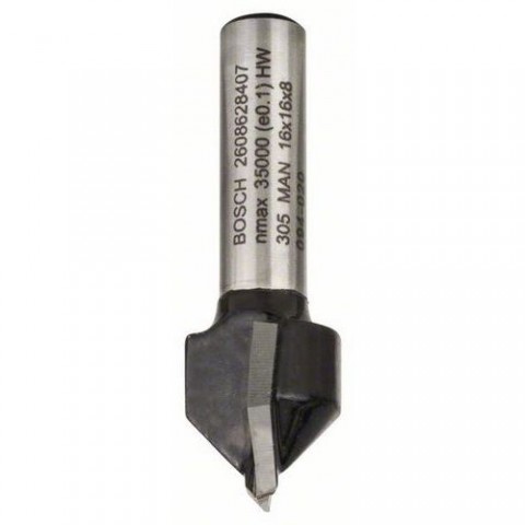 Pro zhotovení jemných drážek písma a dekorativních drážek. Při použití bočního dorazu nebo kopírovacích pouzder také k fazetování hran. Hodí se na masivní dřevo balení: 1 x BAL, 1ks v BAL o: 11; 16 mm celková délka: 45 mm délka: 14; 16 mm o stopky: 8 mmBosch - V-drážkovací frézy, dvoubřité, tvrdokov