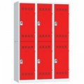 Více-oddílová šatní skříň svařovaná z ocelového plechu tloušťky 0,7 mm. Jednotlivé oddíly jsou samostatně uzamykatelné cylindrickým zámkem se dvěma klíči. Perforovaná dvířka zajišťují účinné odvětrávání vnitřního prostoru. Možnost umístění štítku se jménem.Svařované šatní skříně Vinco, 3 sloupce, 12 boxů, 300 mm, cylindrický zámek