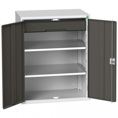Kovové dílenské skříně vybaveny policemi a zásuvkami pro efektivní využití v provozech a dílnách. Svařovaná ocelová konstrukce, povrchová úprava práškovým lakem. Vyztužené křídlové dveře s tříbodovým cylindrickým rozvorovým zámkem se dvěma klíči. Pozinkované police s nosností 75 kg, výškově nastavitelné v rastru 25 mm. Zásuvky s nosností 75 kg a 100% výsuvem na válečkových ložiskách.Dílenské skříně se zásuvkami Bott Verso, výška 100 cm