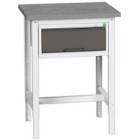 Dílenské stoly Bott Verso s nastavitelnou výškou v rozsahu 78 až 93 cm. Pracovní deska tloušťky 3 cm typu multiplex nebo linoleum. Uzamykatelná zásuvka s nosností 75 kg, výškou 17,5 cm a 100% výsuvem na válečkových ložiskách. Svařovaná ocelová konstrukce, povrchová úprava práškovým lakem. Snadná montáž podle návodu.Dílenské stoly Bott Verso se zásuvkou, šířka 70 cm, výškově nastavitelné, multiplex/linoleum