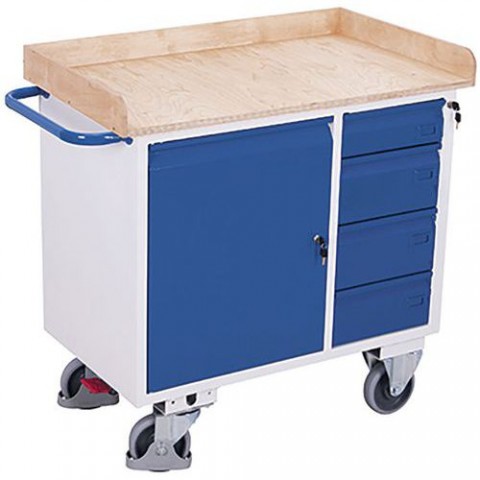 Pojízdný dílenský stůl s pracovní plochou s vyvýšenými hranami, která je vyrobená z bukové překližky. Uzamykatelná skříňka vybavená jednou pevnou a dvěma variabilními policemi (nosnost na polici 30 kg). Čtyři zásuvky s posuvnými pojezdy a centrálním uzamykáním (nosnost zásuvky 25 kg). Zásuvky jsou opatřené štítky pro označení. Praktické madlo usnadňující manipulaci. Mobilitu zajišťují dvě pevná a dvě otočná kola s brzdou.Dílenské vozíky se skříňkou a 4 zásuvkami, vyvýšené hrany, 112,5, x 61 x 104 cm