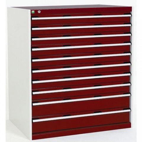 Zásuvkové skříně Bott Cubio se zásuvkami s nosností 75 kg a 100% výsuvy na válečkových ložiskách. Robustní svařovaná ocelová konstrukce s nosností až 1,5 tuny, povrchová úprava práškovým lakem. Systém centrálního zámku i blokace otevření více zásuvek najednou. Ergonomické rukojeti s popisovatelnou lištou, uzamykání cylindrickým zámkem se dvěma klíči.Dílenské zásuvkové skříně Bott Cubio, 120 x 105 x 65-75 cm, 10 zásuvek