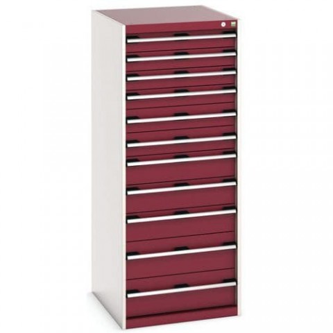 Zásuvkové skříně Bott Cubio se zásuvkami s nosností 75 kg a 100% výsuvy na válečkových ložiskách. Robustní svařovaná ocelová konstrukce s nosností až 1,5 tuny, povrchová úprava práškovým lakem. Systém centrálního zámku i blokace otevření více zásuvek najednou. Ergonomické rukojeti s popisovatelnou lištou, uzamykání cylindrickým zámkem se dvěma klíči.Dílenské zásuvkové skříně Bott Cubio, 160 x 65 x 52,5-75 cm, 11 zásuvek