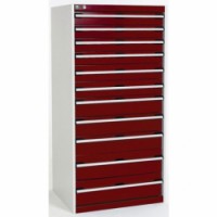 Zásuvkové skříně Bott Cubio se zásuvkami s nosností 75 kg a 100% výsuvy na válečkových ložiskách. Robustní svařovaná ocelová konstrukce s nosností až 1,5 tuny, povrchová úprava práškovým lakem. Systém centrálního zámku i blokace otevření více zásuvek najednou. Ergonomické rukojeti s popisovatelnou lištou, uzamykání cylindrickým zámkem se dvěma klíči.Dílenské zásuvkové skříně Bott Cubio, 160 x 80 x 52,5-75 cm, 11 zásuvek