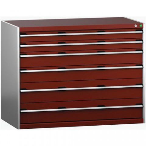 Zásuvkové skříně Bott Cubio se zásuvkami s nosností 200 kg a 100% výsuvy na válečkových ložiskách. Robustní svařovaná ocelová konstrukce s nosností až 1,5 tuny, povrchová úprava práškovým lakem. Systém centrálního zámku i blokace otevření více zásuvek najednou. Ergonomické rukojeti s popisovatelnou lištou, uzamykání cylindrickým zámkem se dvěma klíči.Dílenské zásuvkové skříně Bott Cubio 200, 100 x 130 x 65-75 cm, 6 zásuvek