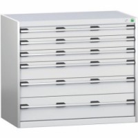 Zásuvkové skříně Bott Cubio se zásuvkami s nosností 200 kg a 100% výsuvy na válečkových ložiskách. Robustní svařovaná ocelová konstrukce s nosností až 1,5 tuny, povrchová úprava práškovým lakem. Systém centrálního zámku i blokace otevření více zásuvek najednou. Ergonomické rukojeti s popisovatelnou lištou, uzamykání cylindrickým zámkem se dvěma klíči.Dílenské zásuvkové skříně Bott Cubio 200, 90 x 105 x 65-75 cm, 6 zásuvek