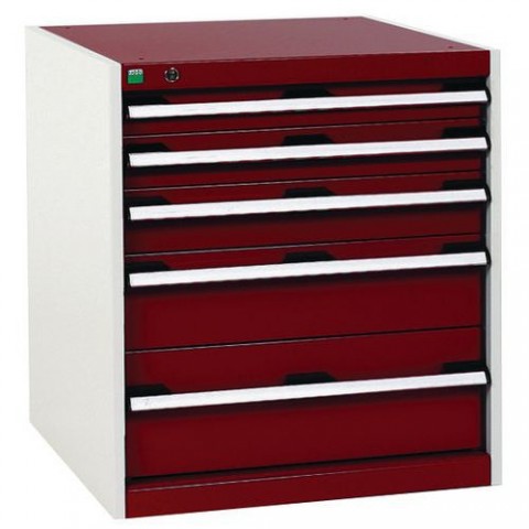 Zásuvkové skříně Bott Cubio se zásuvkami s nosností 75 kg a 100% výsuvy na válečkových ložiskách. Robustní svařovaná ocelová konstrukce s nosností až 1,5 tuny, povrchová úprava práškovým lakem. Systém centrálního zámku i blokace otevření více zásuvek najednou. Ergonomické rukojeti s popisovatelnou lištou, uzamykání cylindrickým zámkem se dvěma klíči.Dílenské zásuvkové skříně Bott Cubio, 70 x 65 x 52,5-75 cm, 5 zásuvek