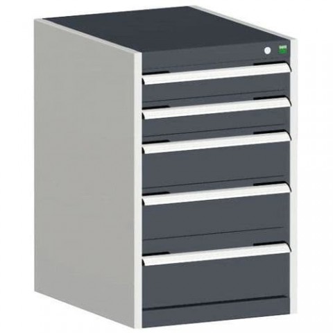 Zásuvkové skříně Bott Cubio se zásuvkami s nosností 75 kg a 100% výsuvy na válečkových ložiskách. Robustní svařovaná ocelová konstrukce s nosností až 1,5 tuny, povrchová úprava práškovým lakem. Systém centrálního zámku i blokace otevření více zásuvek najednou. Ergonomické rukojeti s popisovatelnou lištou, uzamykání cylindrickým zámkem se dvěma klíči.Dílenské zásuvkové skříně Bott Cubio, 80 x 52,5 x 52,5-65 cm, 5 zásuvek