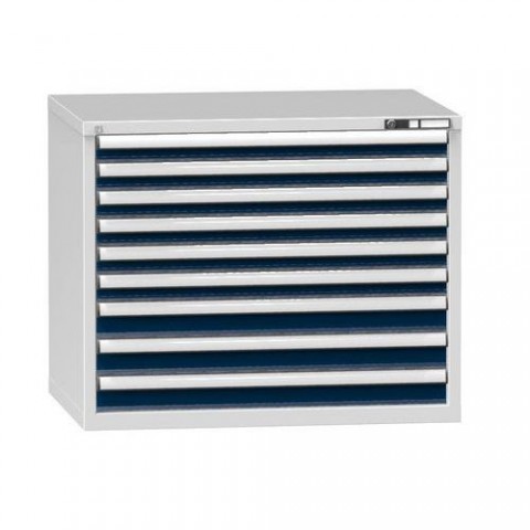 Zásuvkové skříně ZG s výškou 840 mm a devíti zásuvkami. Korpus je vyroben z kvalitních ocelových plechů. Zásuvková skříň je opatřená mechanismem centrálního zamykání a blokace zásuvek. Standardně jsou zásuvkové skříně osazeny cylindrickými zámky, ke každému zámku jsou dodávány dva klíče. K dostání ve 3 barevných variantách.Dílenské zásuvkové skříně ZG, 9 zásuvek, 840 x 1037 x 753 mm, šedá