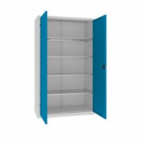 Vysoké kovové skříně se čtyřmi policemi vhodné pro profesionální použití ve vnitřních suchých a větraných prostorách. Monolitická svařovaná konstrukce z oceli tl. 1 mm zajišťuje vysokou pevnost. Křídlové dveře s tříbodovým zámkem RONIS (dodáváno se 2 klíči). Vyrovnávací nožky, které jsou nastavitelné zevnitř. Posuvníky pro snadný pohyb skříně a ochranu podlahy. Pro vysokou bezpečnost lze přikotvit ke zdi. Před lakováním jsou skříně potaženy zirkoniovou vrstvou, která je chrání před korozí a zvyšuje přilnavost laku. Skříně jsou opatřené nátěrem, který má klasifikaci reakce na oheň: A2-s1, d0 dle norem PN-EN 13501-1:2019-02. Vyráběno v souladu s normami ISO:9001 a ISO:14001.Kovové dílenské skříně, 199 x 120 x 50 cm, 4 police