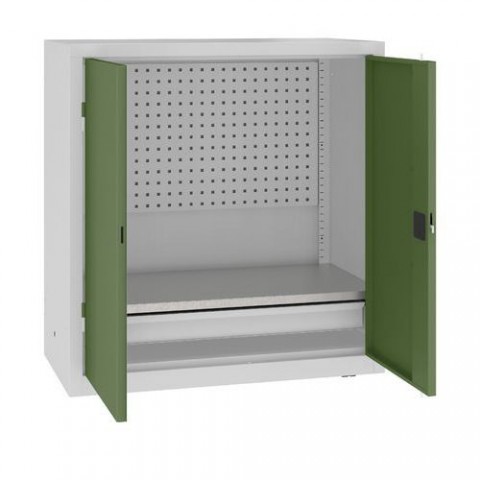 Kovové nízké skříňky pro uložení dílenského nářadí. Vybavené perforovaným panelem, na který lze umístit držáky nářadí a materiálu (nejsou součástí balení). Zásuvka a nastavitelná pozinkovaná police v rastru 25 mm. Monolitická svařovaná konstrukce z oceli tl. 1 mm zajišťuje vysokou pevnost. Vhodné pro profesionální použití ve vnitřních suchých a větraných prostorách. Křídlové dveře s tříbodovým zámkem RONIS (dodáváno se 2 klíči). Vyrovnávací nožky, které jsou nastavitelné zevnitř. Posuvníky pro snadný pohyb skříně a ochranu podlahy. Pro vysokou bezpečnost lze přikotvit ke zdi. Před lakováním jsou skříně potaženy zirkoniovou vrstvou, která je chrání před korozí a zvyšuje přilnavost laku. Skříně jsou opatřené nátěrem, který má klasifikaci reakce na oheň: A2-s1, d0 dle norem PN-EN 13501-1:2019-02. Vyráběno v souladu s normami ISO:9001 a ISO:14001.Kovové dílenské skříně s perfopanelem, 104 x 100 x 50 cm, 1 zásuvka