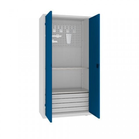 Kovové skříně s perfopanelem pro uložení dílenského nářadí. Vybavené perforovaným panelem, na který lze umístit držáky nářadí a materiálu. 4 zásuvky a 2 nastavitelné pozinkované police v rastru 25 mm. Monolitická svařovaná konstrukce z oceli tl. 1 mm zajišťuje vysokou pevnost. Vhodné pro profesionální použití ve vnitřních suchých a větraných prostorách. Křídlové dveře s tříbodovým zámkem RONIS (dodáváno se 2 klíči). Vyrovnávací nožky, které jsou nastavitelné zevnitř. Posuvníky pro snadný pohyb skříně a ochranu podlahy. Pro vysokou bezpečnost lze přikotvit ke zdi. Před lakováním jsou skříně potaženy zirkoniovou vrstvou, která je chrání před korozí a zvyšuje přilnavost laku. Skříně jsou opatřené nátěrem, který má klasifikaci reakce na oheň: A2-s1, d0 dle norem PN-EN 13501-1:2019-02. Vyráběno v souladu s normami ISO:9001 a ISO:14001.Kovové dílenské skříně s perfopanelem, 199 x 100 x 50 cm, 4 zásuvky