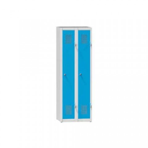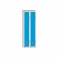 Základní provedení dostupné ve třech výškách – 1200, 1500 a 1850 mm. Variantami jsou skříně jednodvéřové, dvoudvéřové a třídvéřové. Šatníky jsou standardně vybaveny cylindrickým zámkem, dvěma klíči a třemi plastovými háčky. Plechová šatní skříň převážně pro základní školy. Dveře jsou celoplošně vyztužené a pevné v krutu a ohybu. Dveře jsou zavěšeny na kovových pantech originální konstrukce s úhlem otevření 180°. Police ve spodní části skříňky. Cylindrický zámek se dvěma klíči.Kovové šatní skříně 2-dvířkové na soklu, 500 x 500 x 1500 mm