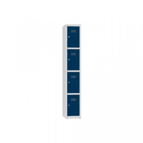 Plechové šatní skříně pro uložení drobných osobních věcí. Dveře jednotlivých boxů jsou uloženy na vnitřních pantech s úhlem otevření více než 90°. Šatníky jsou standardně vybaveny cylindrickým zámkem pro každou buňku (možnost zámku s cylindrickou vložkou nebo uzávěru pro visací zámky). Součástí jsou plastové háčky pro zavěšení uschovaných věcí. Větrací otvory ve dvířkách. K dostání ve třech barevných variantách.Kovové šatní skříně, 4 boxy, 1850 x 300 x 500 mm, šedá