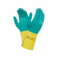 Kyselinovzdorné rukavice s obráceným kosočtverečným povrchem, AQL 0.65. Délka rukavice: 32,3 cm. Doporučené použití: kompletace letadel, výroba baterií, výroba elektroniky. Odvětví: chemický průmysl, elektronika. Velikost: 8, 9, 10 Piktogramy: 1 / X120, 2 / AKL, 4, 6, 9, 10 Normy: EN 388, EN 374, EN 421, EN 420 Materiálové složení: směs latexu a neoprénu, podšívka - česaná bavlna Délka: 32,3cmKyselinovzdorné rukavice ANSELL BI-COLOUR
