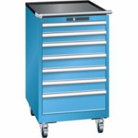 Žebrovaná protiskluzová podložka na vrchu skříně. Ochrana proti prachu, kapalinám díky uzavřenému rámu s povrchem odolným proti nárazům a oděru. Bezpečnostní pojistka zabraňující pádu a individuálnímu zamykaní zásuvek (ochrana proti převrácení). Ochrana proti korozi pomocí elektroforetického imerzního lakování a stříkání. Profesionální označování pomocí softwaru pro označování LISTA Script a výklopné úchytky pro vkládání štítků.Mobilní dílenské zásuvkové skříně LISTA, 5 nebo 7 zásuvek, 564x725x990mm