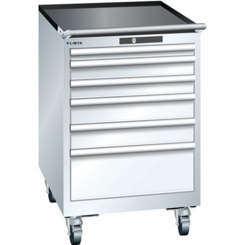 Žebrovaná protiskluzová podložka na vrchu skříně. Ochrana proti prachu, kapalinám díky uzavřenému rámu s povrchem odolným proti nárazům a oděru. Bezpečnostní pojistka zabraňující pádu a individuálnímu zamykaní zásuvek (ochrana proti převrácení). Ochrana proti korozi pomocí elektroforetického imerzního lakování a stříkání. Profesionální označování pomocí softwaru pro označování LISTA Script a výklopné úchytky pro vkládání štítků.Mobilní dílenské zásuvkové skříně LISTA, 564x725x890mm, 5 nebo 6 zásuvek,