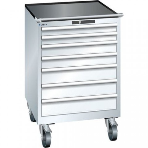 Žebrovaná protiskluzová podložka na vrchu skříně. Pohyb umožnují 4 kolečka a madlo na manipulaci. Ochrana proti prachu, kapalinám díky uzavřenému rámu s povrchem odolným proti nárazům a oděru. Bezpečnostní pojistka zabraňující pádu a individuálnímu zamykaní zásuvek (ochrana proti převrácení). Profesionální označování pomocí softwaru pro označování LISTA Script a výklopné úchytky pro vkládání štítků.Mobilní dílenské zásuvkové skříně LISTA, 7 nebo 8 zásuvek, ŠxVxH – 717x725x1112mm
