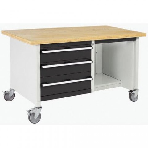 Dílenské stoly Bott Cubio Storage s pracovní deskou tl. 4 cm typu multiplex nebo linoleum. Nosnost až 300 kg, robustní svařovaná ocelová konstrukce, povrchová úprava práškovým lakem. Centrálně uzamykatelné zásuvky s výškou 2 x 15 a 1 x 20 cm, nosností 75 kg a 100% výsuvem na válečkových ložiskách. Oddíl se spodní poloviční policí a volným prostorem nad ní usnadňuje práci v sedě. Dvě pevná a dvě otočná kola s brzdou o průměru 12,5 cm.Mobilní dílenský stůl Bott Cubio Storage, 84 x 150 x 75 cm, 3 zásuvky, police, multiplex/linoleum