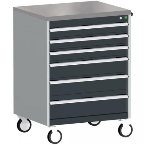 Mobilní zásuvkové skříně Bott Cubio s horní pracovní plochou tloušťky 2 cm typu multiplex/linoleum nebo ohraněný plech s rohoží. Nosnost až 600 kg, robustní svařovaná ocelová konstrukce, povrchová úprava práškovým lakem. Centrálně uzamykatelné zásuvky s výškou 3 x 10, 2 x 15 a 1 x 20 cm, nosností 50 kg a 100% výsuvem na válečkových ložiskách. Ergonomické rukojeti zásuvek s popisovatelnou lištou, systém blokace otevření více zásuvek najednou. Dvě pevná a dvě otočná kola s brzdou o průměru 12,5 cm.Mobilní zásuvková skříň Bott Cubio, 109 x 80 x 65 cm, 6 zásuvek, multiplex/linoleum/rohož
