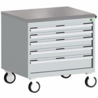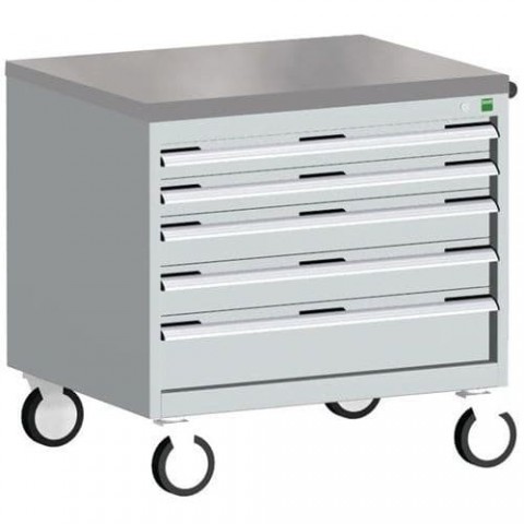 Mobilní zásuvkové skříně Bott Cubio s horní pracovní plochou tloušťky 2 cm typu multiplex/linoleum nebo ohraněný plech s rohoží. Nosnost až 600 kg, robustní svařovaná ocelová konstrukce, povrchová úprava práškovým lakem. Centrálně uzamykatelné zásuvky s výškou 2 x 7,5 cm, 2 x 10 a 2 x 15 cm, nosností 50 kg a 100% výsuvem na válečkových ložiskách. Ergonomické rukojeti zásuvek s popisovatelnou lištou, systém blokace otevření více zásuvek najednou. Dvě pevná a dvě otočná kola s brzdou o průměru 12,5 cm.Mobilní zásuvková skříň Bott Cubio, 79 x 80 x 65 cm, 5 zásuvek, multiplex/linoleum/rohož