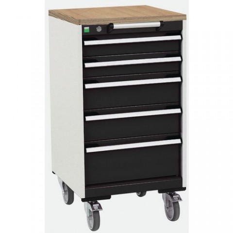 Mobilní zásuvkové skříně Bott Cubio s horní pracovní plochou tloušťky 2 cm typu multiplex/linoleum nebo ohraněný plech s rohoží. Nosnost až 300 kg, robustní svařovaná ocelová konstrukce, povrchová úprava práškovým lakem. Centrálně uzamykatelné zásuvky s výškou 2 x 10, 2 x 15 a 1 x 20 cm, nosností 50 kg a 100% výsuvem na válečkových ložiskách. Ergonomické rukojeti zásuvek s popisovatelnou lištou, systém blokace otevření více zásuvek najednou. Dvě pevná a dvě otočná kola s brzdou o průměru 12,5 cm.Mobilní zásuvková skříň Bott Cubio, 99 x 52,5 x 52,5 cm, 5 zásuvek, multiplex/linoleum/rohož