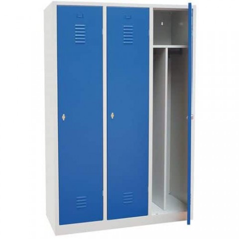 Sestava tří šatních skříněk na čisté a špinavé prádlo s vnitřním dělením mezistěnou. Křídlové dveře jsou zavěšené na vnitřních pantech a lze je otevřít až o 115 °. Tiché dovírání díky plastovým dorazům. Možnost umístění jmenovky do štítku na dveřích. Kryté perforované otvory v horní části dveří zajišťují cirkulaci vzduchu. Odkládací polička ve vrchní části skříně, tyč se dvěma háčky pro zavěšení oděvů. Celokovová konstrukce z ocelového plechu tl. 0,6 mm. Skříň je umístěná na vyvýšeném soklu. Uzamykání pomocí cylindrického zámku (dodáváno se 2 klíči) nebo otočným uzávěrem v kombinaci s visacím zámkem (výška třměnu 40 mm, průměr tměnu 6 mm).Montované šatní skříně s mezistěnou Manutan Expert IS, 3 oddíly