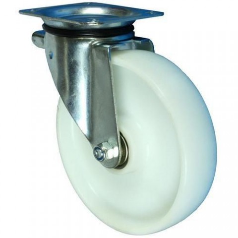 Otočná průmyslová kola s obručí z bílého nylonu a s dvouřadým kuličkovým věncem ve vidlicové hlavě. typ kol: otočná materiál kol: nylon průměr kola: 150 - 200 mm šířka kola: 45 mm nosnost: 400 kg způsob uchycení: vidlice s přírubou výška kola s vidlicí: 195 - 235 mm vyložení kola: 43 - 57 mm ložiska: valivá (kuličková) povrchová úprava pozinkováním, dvouřadý kuličkový věnec ve vidlicové hlavě, teplotní odolnost -40 až +80 °C, odolné proti koroziNylonová transportní kola s přírubou, průměr 150 - 200 mm, otočná, valivá ložiska
