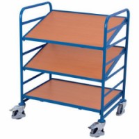 Vozík se třemi policemi z bukových MDF desek. Naklonění horní a prostřední police o 17° nebo 32°, nosnost 50 kg na polici. Vzdálenost mezi příčnými trubkami 125 mm. Rozteč otvorů pro přišroubování polic 150 mm. 4 otočná kola, z nichž dvě jsou opatřená brzdou. Šedá kola z termoplastické pryže nezanechávající stopy na plastovém ráfku s přesnými kuličkovými ložisky.Policové vozíky Euro se šikmými policemi, 3 police, 93,5 x 66,5 x 112,5 cm
