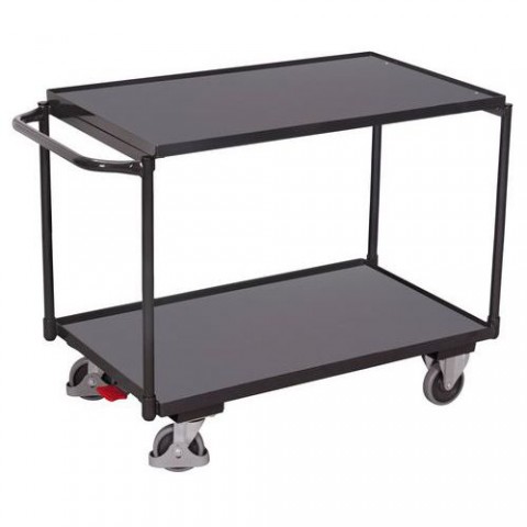 Policové vozíky se dvěma policemi vhodné pro přepravu materiálu a předmětů ve skladech. Police vyrobené z MDF desek jsou zasazené do kovových rámů vozíku. Pojezd zajišťují čtyři kola s valivými kuličkovými ložisky, z nichž dvě jsou pevná a dvě otočná s brzdou Easy Stop a ochrannými kryty.Policové vozíky s madlem, do 250 kg, 2 police