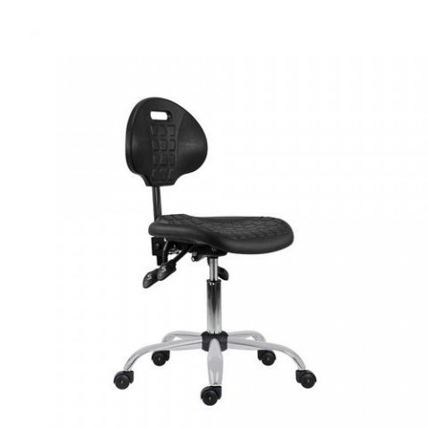 Pracovní židle s plně antistatickými ESD účinky konstruovaná tak, aby odváděla statickou elektřinu z pracoviště s přítomností elektronických komponentů a těkavých chemikálií. Všechny součásti židle (včetně speciálního antistatického PU materiálu a koleček) jsou vodivé, měřený odpor ? 0,1 M? . Polyuretanový sedák a opěrák v černém provedení. Opěrák lze výškově nastavit dle potřeb uživatele. Asynchronní mechanismus s možností nezávislého nastavení úhlu sedáku i opěráku a aretací v libovolných pozicích. Ocelová chromovaná báze s ESD kolečky o O 50 mm s gumovou obručí - univerzálně použitelné na všechny typy povrchů . Židle vyhovuje normě ČSN EN 61340-5-1. Nosnost 150 kg.Pracovní antistatická židle PU ASYN C PLUS