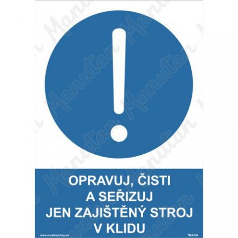 Bezpečnostní značení tabulkou, značkou nebo samolepkou "Opravuj, čisti a seřizuj jen zajištěný stroj v klidu" tiskneme na vysoce kvalitním materiálu, barvami s vysokou odolností proti otěru a UV záření. Tím zajišťujeme splnění požadavků Nařízení vlády č. 375/2017 Sb., ČSN ISO 3864-1, ČSN ISO 3864-2, ČSN ISO 3864-3, ČSN ISO 3864-4.Příkazové tabulky - Opravuj, čisti a seřizuj jen zajištěný stroj v klidu