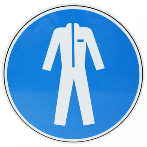 Značka ukládající povinnost nosit ochranný oděv v určité oblasti. Hliníkový panel. Polymerová laminace - chrání výtisk před fyzickým poškozením a filtruje část UV paprsků.Příkazové značení Manutan Expert - Použij ochranný oděv, hliník, 200 mm