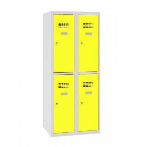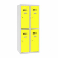 Svařované šatní skříně se čtyřmi oddíly vhodné do škol. Díky snížené výšce jsou ideální i pro žáky prvního stupně. Vyrobeny z ocelového plechu s povrchovou úpravou práškovým lakem. Skříně jsou vybaveny dvěma policemi na knihy a háčkem na oblečení. Větrací mřížky ve dveřích, úhel otevření dveří s bezpečnostní pojistkou max. na 90°, samolepicí štítek na jméno, možnost dokoupení horního šikmého nástavce. Uzamykání cylindrickým zámkem se dvěma klíči.Snížené školní šatní skříně, 4 oddíly, 300 mm, cylindrický zámek