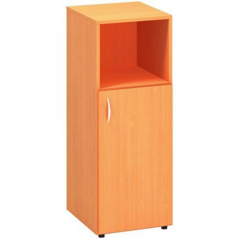 Kancelářské skříňky s nikou a dvířky ve čtyřech barevných provedeních. Korpusy jsou vyrobeny z laminované dřevotřísky tloušťky 18 mm s ABS hranou 1 mm. Záda skříní tvoří laminovaná dřevotříska o tloušťce 8 mm. Dřevěná police je upevněna kovovými trny, které zamezují jejímu nežádoucímu vysunutí. Kancelářské skříně jsou vysoce odolné proti mechanickému poškození a disponují zvýšenou odolností vůči nadměrné vlhkosti. Pomocí aretačních šroubů umístěných ve dně korpusu lze vyrovnat nerovnosti podlahy a zajistit tak vyšší stabilitu skříňky. Skříně splňují normy ISO 9001, ISO 14001, ČSN 18001, Ekologicky šetrný výrobek.Střední úzké skříně Alfa 500, 106,3 x 40 x 47 cm, s nikou a dvířky - pravé provedení