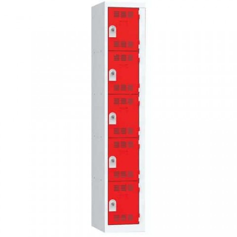 Více-oddílová šatní skříň svařovaná z ocelového plechu tloušťky 0,7 mm. Jednotlivé oddíly jsou samostatně uzamykatelné otočným uzávěrem na visací zámek (není součástí dodávky). Perforovaná dvířka zajišťují účinné odvětrávání vnitřního prostoru. Možnost umístění štítku se jménem.Svařované šatní skříně Vinco, 1 sloupec, 5 boxů, 300 mm, otočný uzávěr