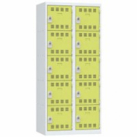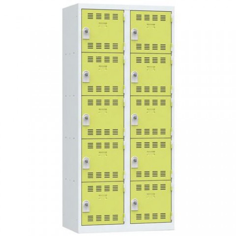 Více-oddílová šatní skříň svařovaná z ocelového plechu tloušťky 0,7 mm. Jednotlivé oddíly jsou samostatně uzamykatelné otočným uzávěrem na visací zámek (není součástí dodávky). Perforovaná dvířka zajišťují účinné odvětrávání vnitřního prostoru. Možnost umístění štítku se jménem.Svařované šatní skříně Vinco, 2 sloupce, 10 boxů, 400 mm, otočný uzávěr