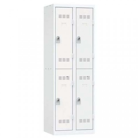 Více-oddílová šatní skříň svařovaná z ocelového plechu tloušťky 0,7 mm. Každý oddíl je vybaven tyčí na ramínka a dvěma háčky (uzamykání otočným uzávěrem na visací zámek - není součástí dodávky). Perforovaná dvířka zajišťují účinné odvětrávání vnitřního prostoru. Možnost umístění štítku se jménem.Svařované šatní skříně Vinco, 2 sloupce, 4 boxy, 300 mm, otočný uzávěr