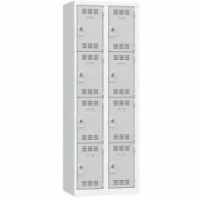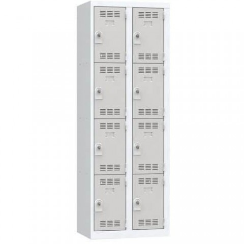 Více-oddílová šatní skříň svařovaná z ocelového plechu tloušťky 0,7 mm. Jednotlivé oddíly jsou samostatně uzamykatelné otočným uzávěrem na visací zámek (není součástí dodávky). Perforovaná dvířka zajišťují účinné odvětrávání vnitřního prostoru. Možnost umístění štítku se jménem.Svařované šatní skříně Vinco, 2 sloupce, 8 boxů, 300 mm, otočný uzávěr