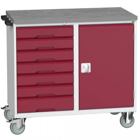 Mobilní údržbový vozík Bott Verso s horní pracovní plochou tloušťky 3 cm typu multiplex/linoleum nebo ohraněný plech s rohoží. Nosnost až 200 kg, robustní svařovaná ocelová konstrukce, povrchová úprava práškovým lakem. Centrálně uzamykatelné zásuvky s výškou 6 x 10 a 1 x 12,5 cm, s nosností 50 kg a 100% výsuvem na válečkových ložiskách. Uzamykatelná skříňka s výškou dveří 72,5 cm, uvnitř pozinkovaná výškově nastavitelná police s nosností 75 kg. Ergonomické rukojeti zásuvek s popisovatelnou lištou, systém blokace otevření více zásuvek najednou. Dvě pevná a dvě otočná kola s brzdou o průměru 12,5 cm, manipulaci usnadňují madla.Údržový zásuvkový vozík Bott Verso, 98 x 105 x 55/60 cm, 7 zásuvek, skříňka, multiplex/linoleum/rohož