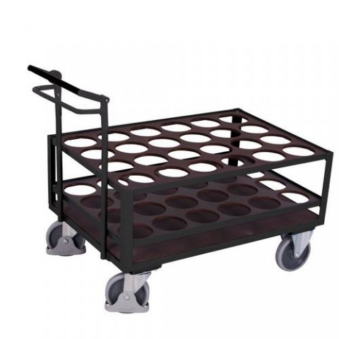 Vozík s protiskluzovým povrchem a dvěma patry s otvory pro vertikální uložení lahví se stlačeným vzduchem. 2 úrovně 15mm protiskluzové překližky s 24 otvory o průměru 160 mm (výška 90 mm a 350 mm od základní desky). Nosnost 80 kg na polici. Ruční brzda, která při uvolnění okamžitě zastaví celý vozík (dead man's brake). 2 otočná a 2 pevná kola. Šedá kola z termoplastické pryže nezanechávající stopy na plastovém ráfku s přesnými kuličkovými ložisky.Vozíky na ocelové válce s protiskluzovým povrchem a ruční brzdou, 128 x 77,5 x 109,5 cm