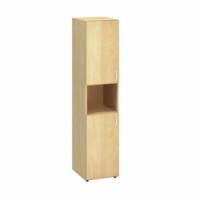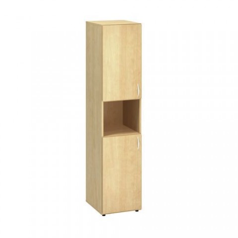 Vysoké kancelářské skříňky se dvěma dvířky a nikou ve čtyřech barevných provedeních. Vrchní a spodní části skříní jsou odděleny nikou. Korpusy jsou vyrobeny z laminované dřevotřísky tloušťky 18 mm s ABS hranou 1 mm. Záda skříní tvoří laminovaná dřevotříska o tloušťce 8 mm. Dřevěné police jsou upevněny kovovými trny, které zamezují jejich nežádoucímu vysunutí. Kancelářské skříně jsou vysoce odolné proti mechanickému poškození a disponují zvýšenou odolností vůči nadměrné vlhkosti. Pomocí aretačních šroubů umístěných ve dně korpusu lze vyrovnat nerovnosti podlahy a zajistit tak vyšší stabilitu skříňky. Skříně splňují normy ISO 9001, ISO 14001, ČSN 18001, Ekologicky šetrný výrobek.Vysoké úzké skříně Alfa 500, 178 x 40 x 47 cm, s nikou a dvířky - levé provedení