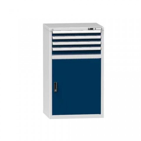 Zásuvková skříň je opatřená mechanismem centrálního zamykání a blokace zásuvek. Zásuvky jsou základním skladovacím prvkem, a proto splňují vysoké požadavky na pevnost a stabilitu. Korpusy zásuvkových skříní tvoří svařenec jednotlivých konstrukčních dílů z kvalitních ocelových plechů. Vnitřní konstrukce korpusů je opatřena perforací po 25 mm. Tuto perforaci využíváme k uchycení vodicích lišt zásuvek, jejich výškovému uspořádání a nakonfigurování požadované zásuvkové sestavy. Přestavování vodicích lišt nebo háčků polic probíhá jednoduše a velice rychle bez použití nástrojů.Zásuvkové skříně ZD1, 731 x 600 x 1215 mm
