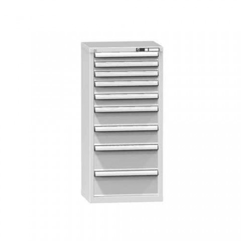 Zásuvková skříň je opatřená mechanismem centrálního zamykání a blokace zásuvek. Zásuvky jsou základním skladovacím prvkem, a proto splňují vysoké požadavky na pevnost a stabilitu. Korpusy zásuvkových skříní tvoří svařenec jednotlivých konstrukčních dílů z kvalitních ocelových plechů. Vnitřní konstrukce korpusů je opatřena perforací po 25 mm. Tuto perforaci využíváme k uchycení vodicích lišt zásuvek, jejich výškovému uspořádání a nakonfigurování požadované zásuvkové sestavy. Přestavování vodicích lišt nebo háčků polic probíhá jednoduše a velice rychle bez použití nástrojů.Zásuvkové skříně ZN4, 578 x 464 x 1215 mm