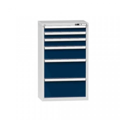 Zásuvková skříň je opatřená mechanismem centrálního zamykání a blokace zásuvek. Zásuvky jsou základním skladovacím prvkem, a proto splňují vysoké požadavky na pevnost a stabilitu. Korpusy zásuvkových skříní tvoří svařenec jednotlivých konstrukčních dílů z kvalitních ocelových plechů. Vnitřní konstrukce korpusů je opatřena perforací po 25 mm. Tuto perforaci využíváme k uchycení vodicích lišt zásuvek, jejich výškovému uspořádání a nakonfigurování požadované zásuvkové sestavy. Přestavování vodicích lišt nebo háčků polic probíhá jednoduše a velice rychle bez použití nástrojů.Zásuvkové skříně ZP5, 731 x 464 x 1215 mm