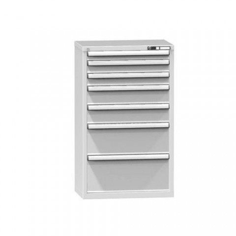 Zásuvková skříň je opatřená mechanismem centrálního zamykání a blokace zásuvek. Zásuvky jsou základním skladovacím prvkem, a proto splňují vysoké požadavky na pevnost a stabilitu. Korpusy zásuvkových skříní tvoří svařenec jednotlivých konstrukčních dílů z kvalitních ocelových plechů. Vnitřní konstrukce korpusů je opatřena perforací po 25 mm. Tuto perforaci využíváme k uchycení vodicích lišt zásuvek, jejich výškovému uspořádání a nakonfigurování požadované zásuvkové sestavy. Přestavování vodicích lišt nebo háčků polic probíhá jednoduše a velice rychle bez použití nástrojů.Zásuvkové skříně ZP6, 731 x 464 x 1215 mm