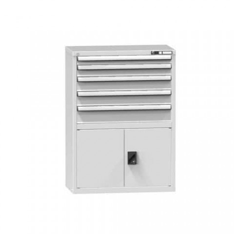 Zásuvková skříň je opatřená mechanismem centrálního zamykání a blokace zásuvek. Zásuvky jsou základním skladovacím prvkem, a proto splňují vysoké požadavky na pevnost a stabilitu. Korpusy zásuvkových skříní tvoří svařenec jednotlivých konstrukčních dílů z kvalitních ocelových plechů. Vnitřní konstrukce korpusů je opatřena perforací po 25 mm. Tuto perforaci využíváme k uchycení vodicích lišt zásuvek, jejich výškovému uspořádání a nakonfigurování požadované zásuvkové sestavy. Přestavování vodicích lišt nebo háčků polic probíhá jednoduše a velice rychle bez použití nástrojů.Zásuvkové skříně ZR2, 884 x 464 x 1215 mm