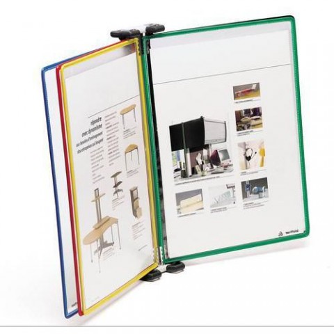 Nástěnné držáky s průhlednými informačními tabulkami. Vhodné použití tam, kde je zapotřebí zviditelnit více dokumentů na malém prostoru. Držák vyroben z lakovaného kovu RAL 7035, kapsy z polyvinylchloridu v černé, červené, žluté, zelené a modré barvě.Závěsné držáky Tarifold Madrid s rámečky