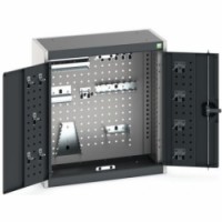 Závěsná kovová skříňka s perforací a sadou držáků na nářadí. Zadní část skřínky a vnitřní část dveří jsou opatřeny perforovanými panely pro uchycení držáků nářadí (typ perfo). Robustní svařovaná ocelová konstrukce s nosností až do 1 tuny, povrchová úprava práškovým lakem. Zamykání cylindrickým zámkem se dvěma klíči. Sada 20 držáků na nářadí obsahuje: 1 x držák imbusových klíčů, 1 x držák šroubováků, 1 x držák vrtáků, 1 x držák klíčů, 1 x držák na pilu, 5 x dvojitý háček O6 x 75 mm, 5 x klip na nářadí O 13 mm, 5 x jednoduchý háček O6 x 25 mm. Sada 40 držáků na nářadí obsahuje: 1 x držák imbusových klíčů, 1 x držák šroubováků, 1 x držák vrtáků, 1 x držák klíčů, 1 x držák na pilu, 5 x dvojitý háček O6 x 150 mm, 5 x dvojitý háček O6 x 75 mm, 5 x klip na nářadí O 13 mm, 5 x klip na nářadí O 25 mm, 5 x jednoduchý háček O6 x 25 mm, 5 x jednoduchý háček O6 x 50 mm, 5 x držák kleští š. 55 mm.Závěsné skříňky Bott Cubio s držáky na nářadí a perfopanely